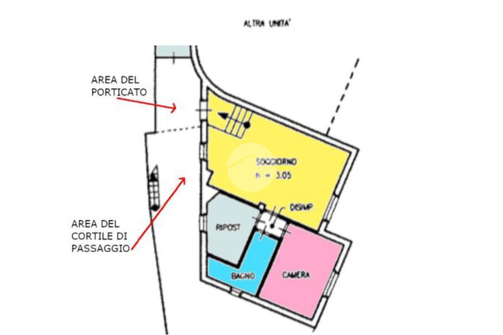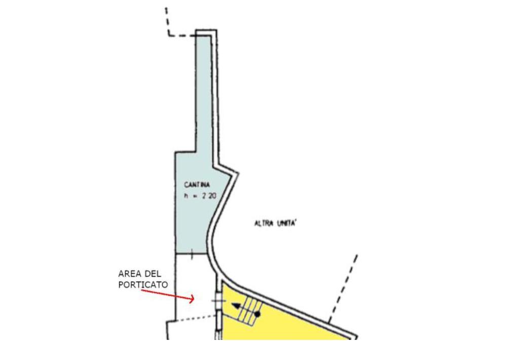 Dall'accesso su strada si raggiunge l'appartamento tramite una scalinata esterna che scende al livello inferiore e conduce fino al piccolo cortile di passaggio su cui si affacciano l'ingresso principale, un piccolo portico e la cantina.